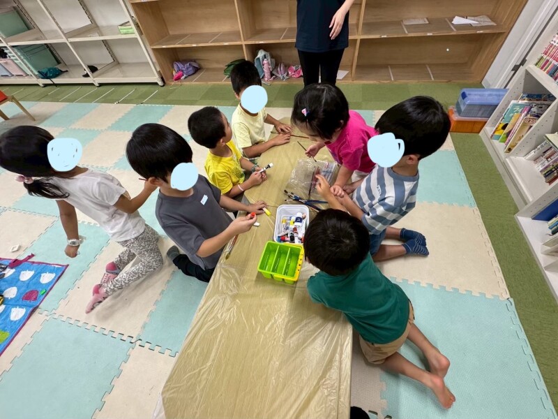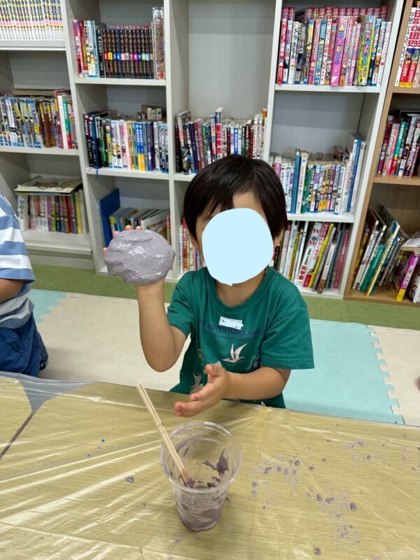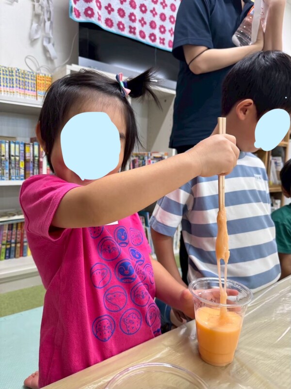 自分の好きな色を選んで絵の具を混ぜて、プルプルの感触のスライムが出来上がると、みんな大喜びで子ども同士でスライムを見せ合ったり、ジュース屋さんをして楽しんでいました🍹