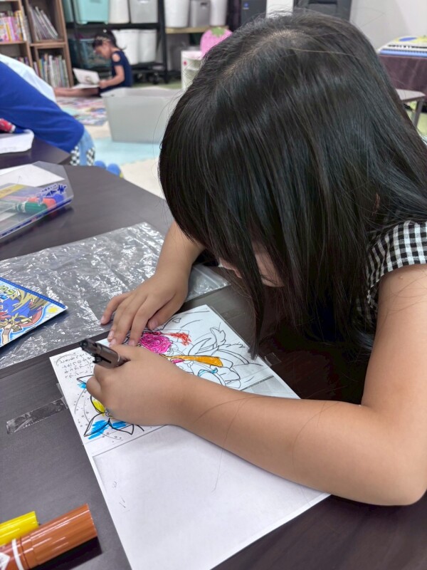 出来上がった塗り絵は、先生が他のお友達に紹介したり、お部屋に貼ったりして子どもができた喜びが味わえるようにしています♪