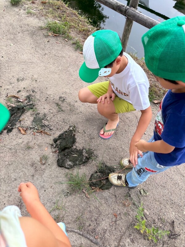 外遊びでは公園に行き、ビオトープの中を観察して自然に親しみながら遊ぶ姿がありました🍂