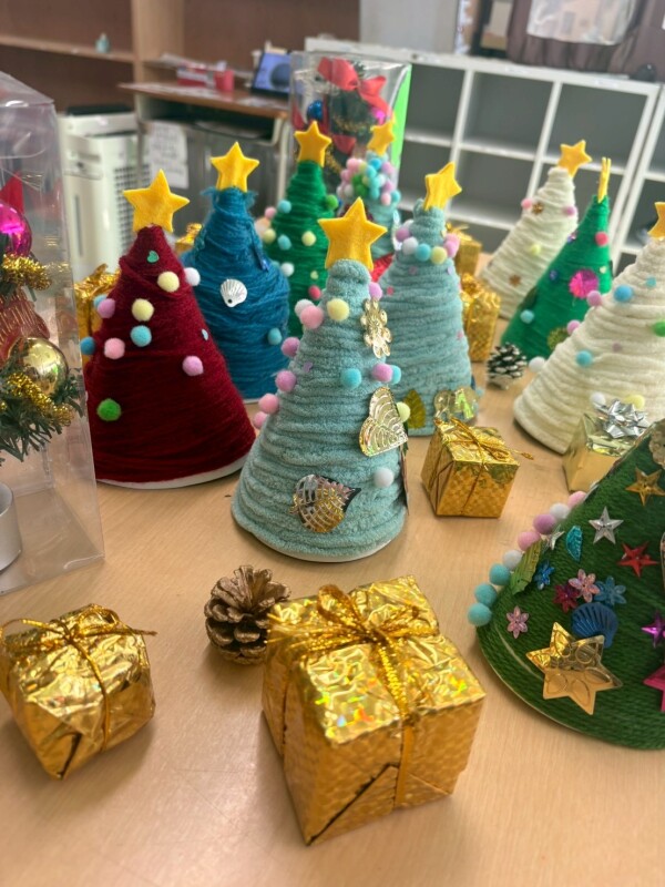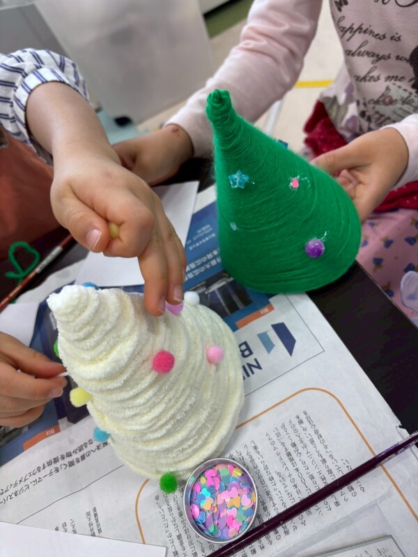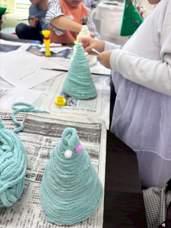 とても可愛い色の毛糸をぐるぐる巻き付けて、好きなパーツを選んで可愛いツリーができあがりました!
